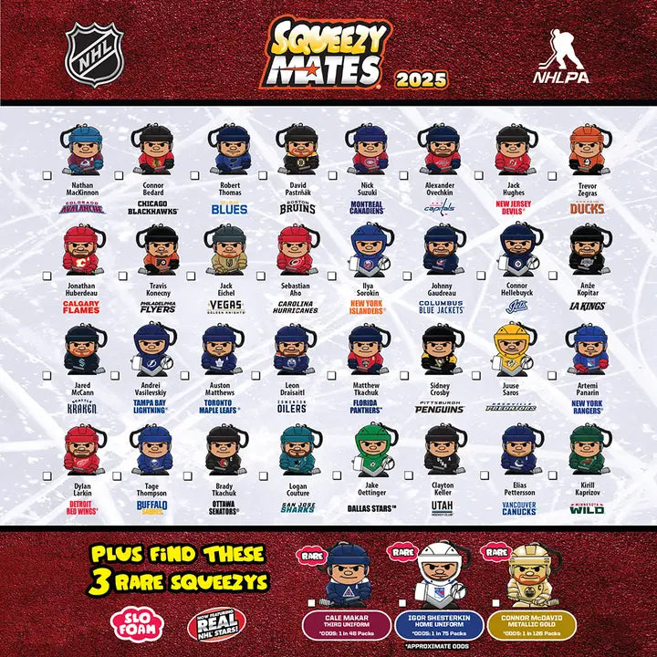 Made from the fun to squeeze material, Slo-Foam, SqueezyMates are collectible and squishy NHL figures!